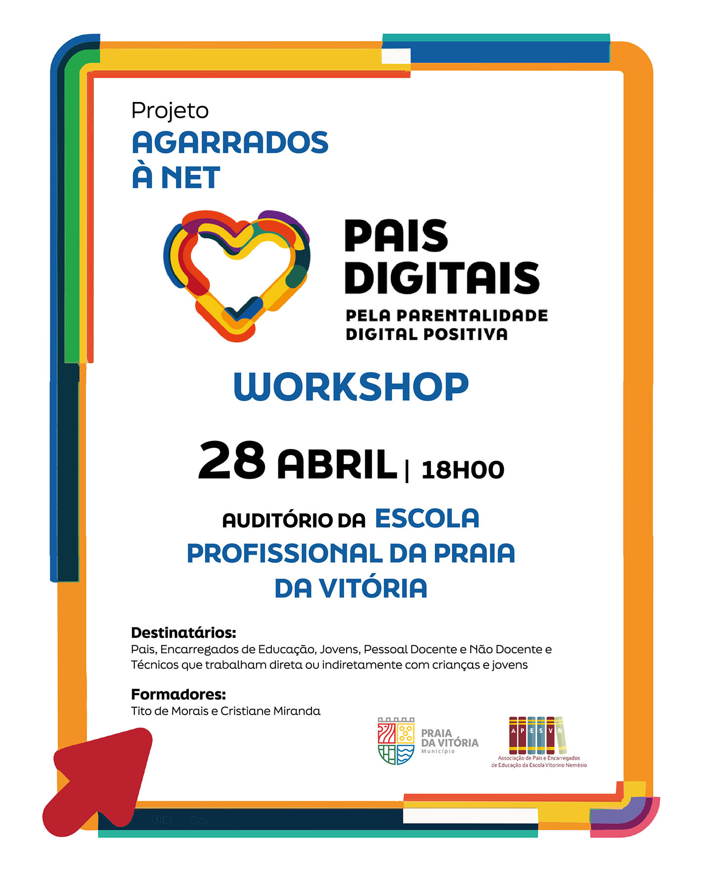 A Associação de Pais e Encarregados de Educação da Escola Secundária Vitorino Nemésio promove, na sua escola nos dias 27 e 28 de Abril de 2026, uma ação de sensibilização integrada no projeto "Agarrados à Net", da autoria de Tito de Morais e Cristiane Miranda, que visa a promoção do bem-estar digital de crianças, jovens e adultos, ajudando famílias, escolas e comunidade na prevenção e combate aos impactos negativos de violência sexual baseada em imagens, aliciamento sexual de crianças online, partilha não consentida de conteúdos íntimos e influenciadores digitais.